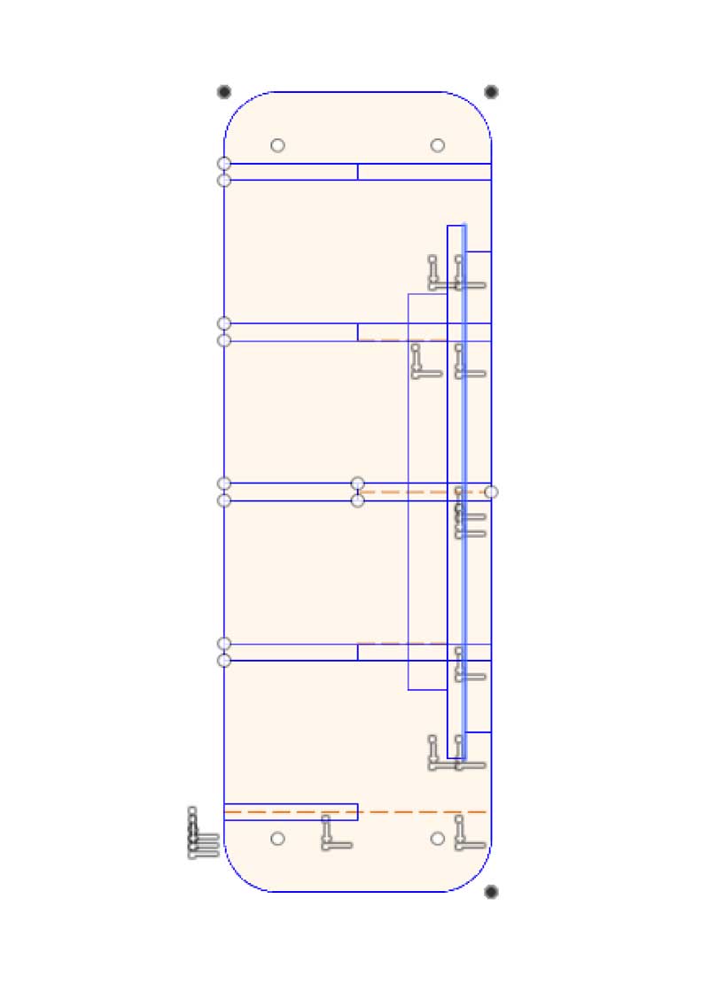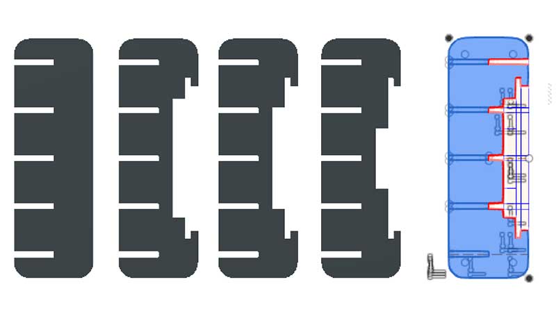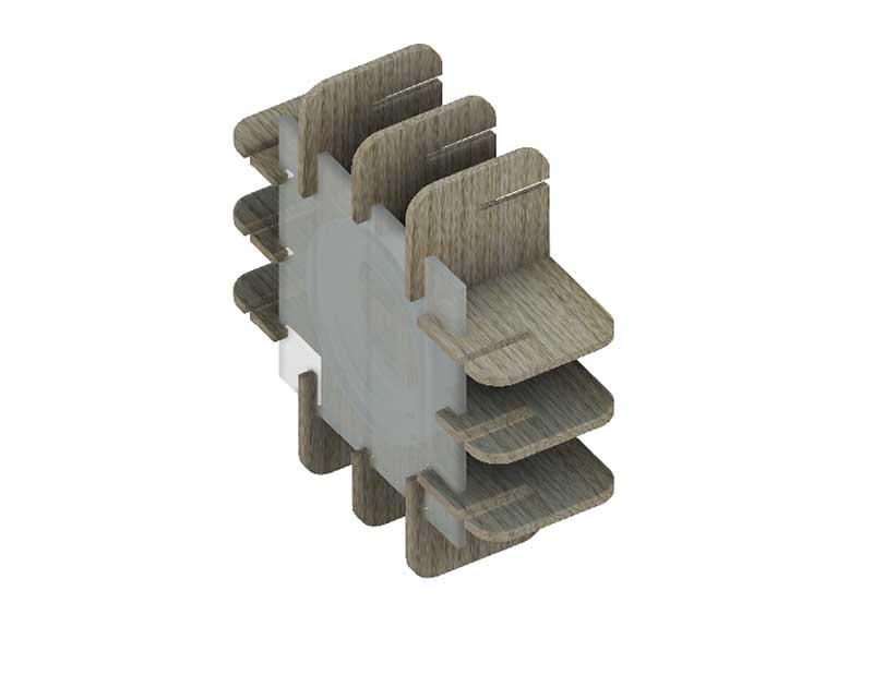 I cut the parts out of cardboard to test the design. It worked nicely in the sense that I was able to press-fit the holder into the structure which is what I was hoping. I made another test with plywood to test the strength. I hadn't quite figured out how to get the Acrylic in. I needed to remove some of the slots so it would fit in. I really did not like the look of this design so I abandoned it in favor of a simpler look.