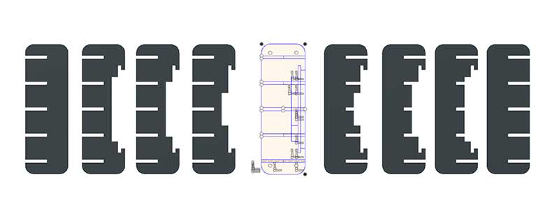 In the end it would take about 10 slices to make this version. I tried to re-design the object to look a little less heavy. I used one sketch to generate the different parts. I just had to select which elements I needed to extrude in order to create enough parts to press-fit around the Neopixel / circuit holder.