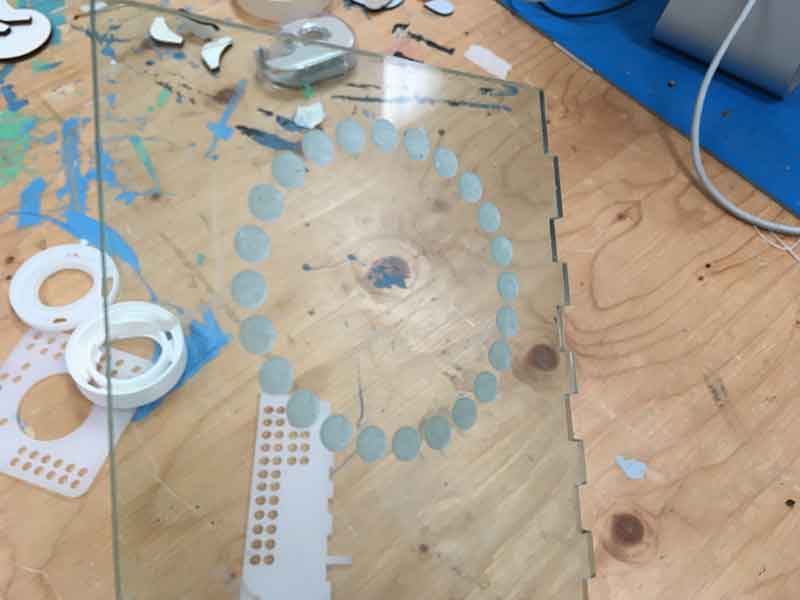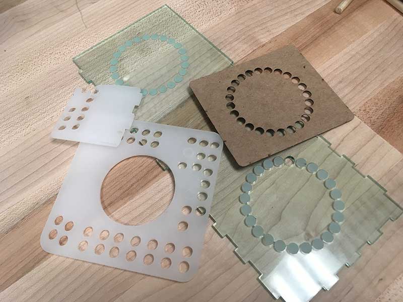 I had a piece of white Trotec Troglass LED matt white acrylic that is meant for light diffusion. The challenge was to keep the colors of the LEDs from bleeding into each other. Using a large sheet would clearly not work. I could divide larger sections of color but with the color clock I needed to be able to have more definition so that the individual dots could be seen.
