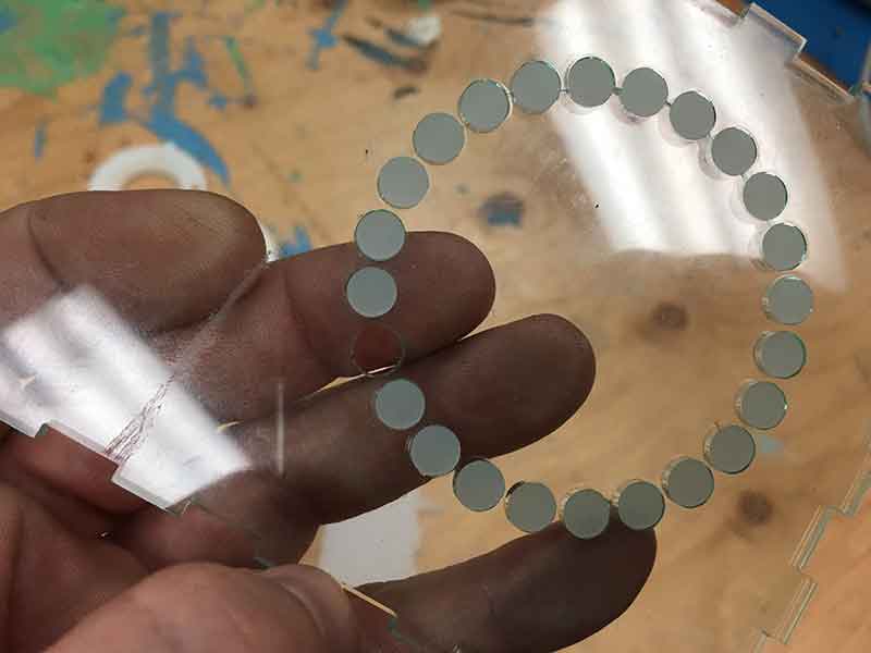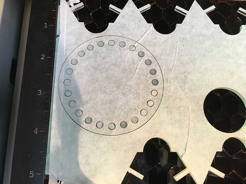 Getting the right dots to effectively press-fit into the material took several tests. The size of the sketch for each dot is 6.35 mm and the right size to cut was 6.55 mm. This means that the kerf of the laser was around .2 mm