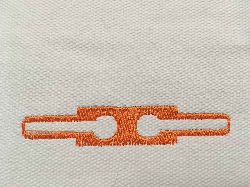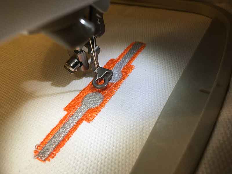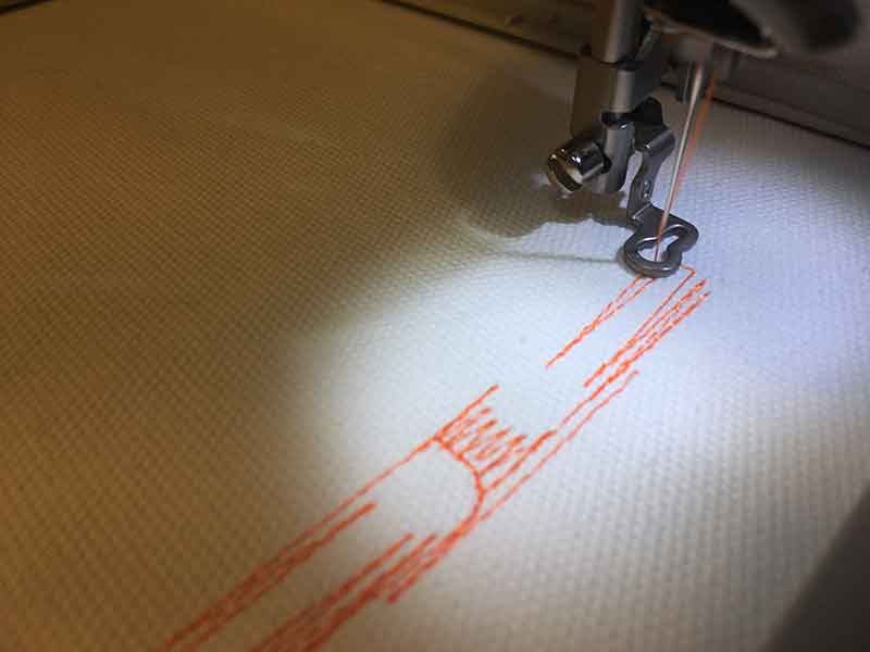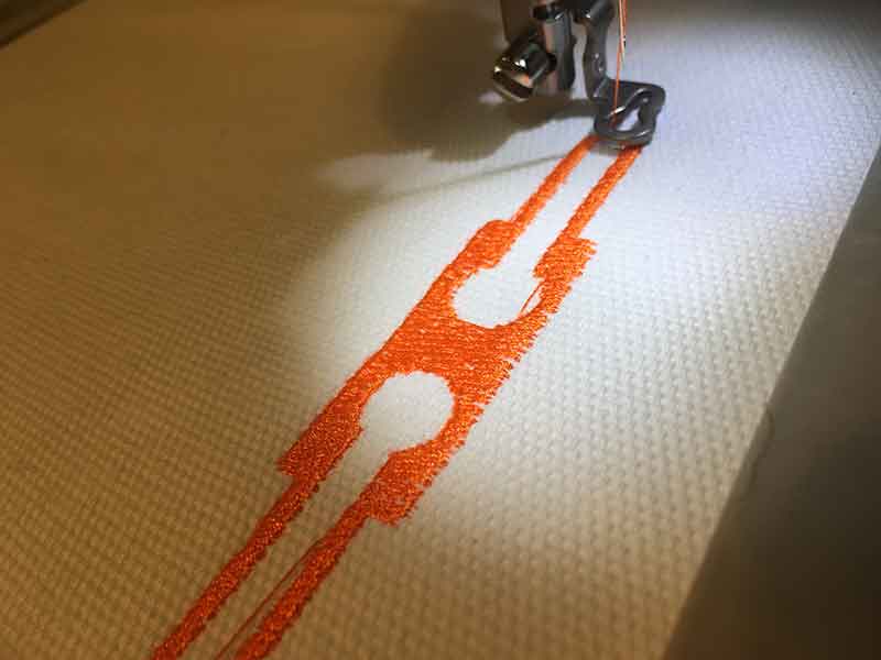 The embroidery machine started first by laying out the orange thread. It starts off with the cross stitch and then continues to embroider the thread at a 90º as I had selected in the Sewart software.