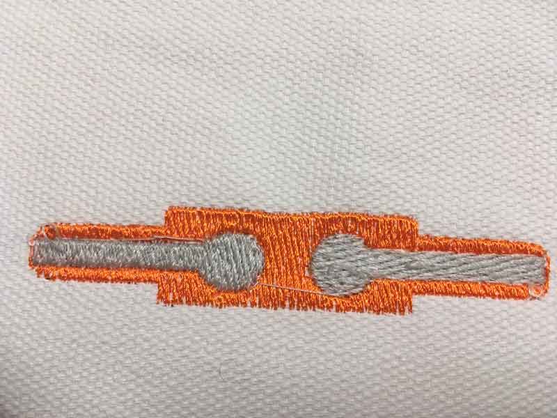 The initial vector drawing for the button was a two color image. The grey sections are conductive thread and the orange is just decorative. The embroiderer sees this as two separate thread types and pauses the job so you can change the thread in the machine. A very simple process.