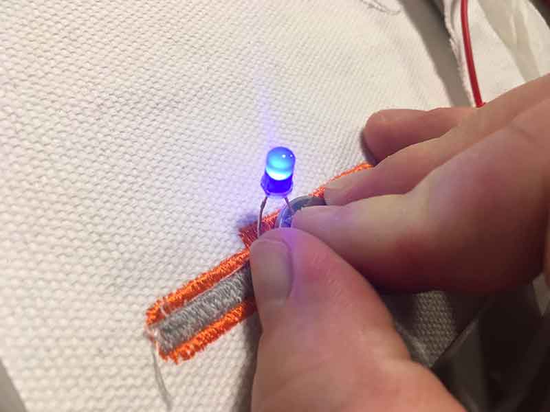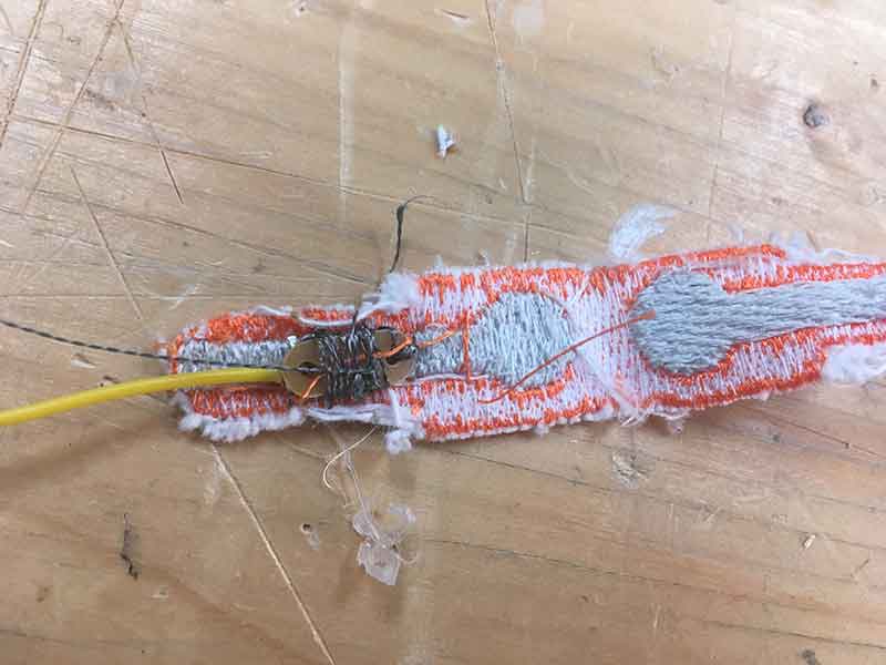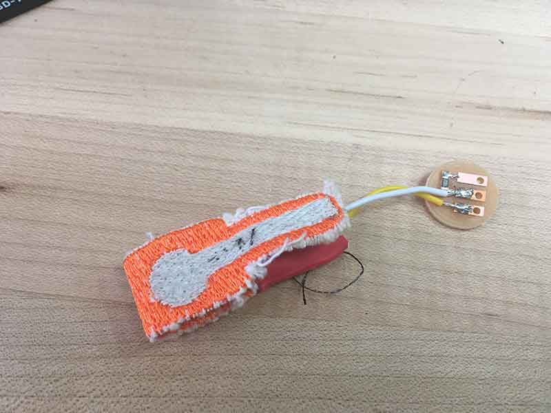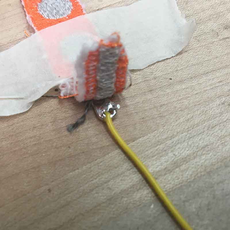 The final look of the orange embroidery was nice and clean. Once it was completed the machine paused and I swicthed the embroidery thread and the bobbin thread from regular to conductive thread. I was a bit worried about removing the embroidery loop in order to change the bobbin thread underneath. It is not the most gentel process and I did not want to somehow miss-align the needle.
