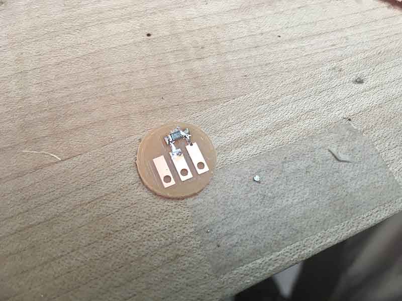 Now that the button was made, I needed to attach it to the rest of the clock. Before I could do that, I needed to make a pull-down resistor and find ways to make an adaptor from conductive thread into hook-up wire. I quickly milled a little circuit and added a 10k resistor to bridge between ground and one end of the button.