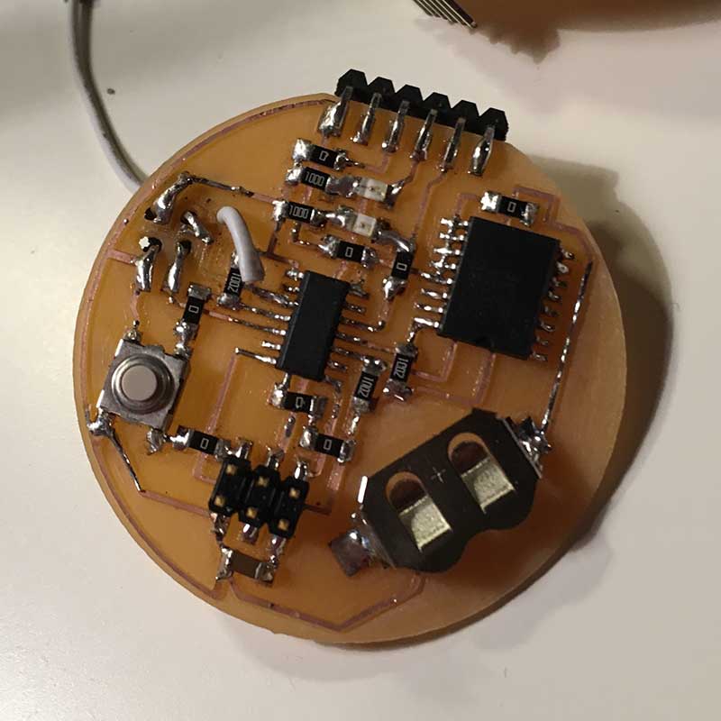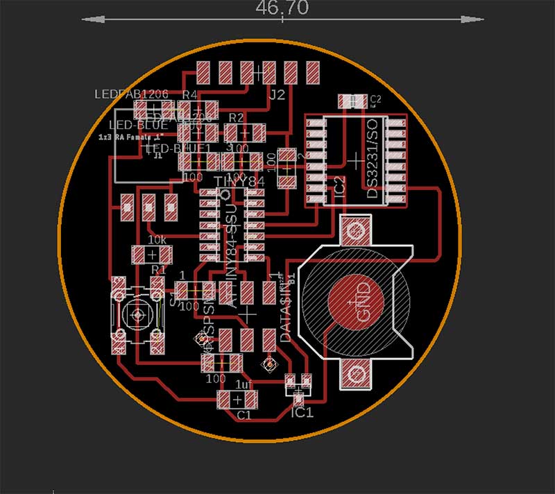 As I mention in Week 18, the goal of this project is to make an object that demonstrates time well spent in a Fab Lab. An artifact that was made using many processes from Fab Academy assignments so that when you look at it you are reminded of the time spent learning new processes. At the core of this project, is a custom circuit. Because embedded programming and electronics is a recurring theme in the Fab Academy, it seems appropriate to me that it be central in this design. I also really like the look of a milled circuit and I wanted to highlight this.