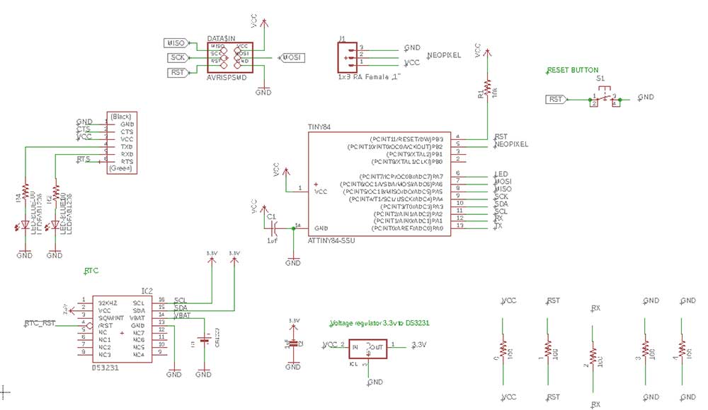 The Color Clock is essentially two chips. An ATtiny84 and a DS3231 Real Time Clock. The RTC only requires 2 pins to interact with the ATtiny84: