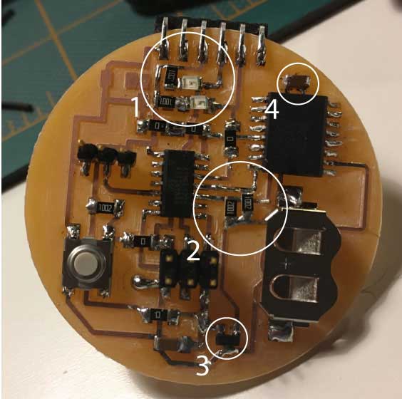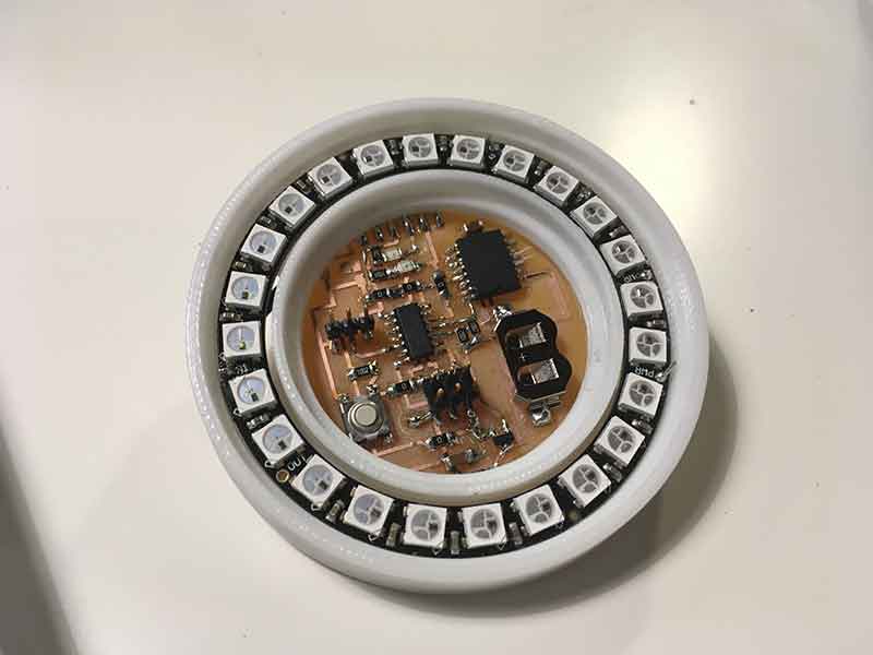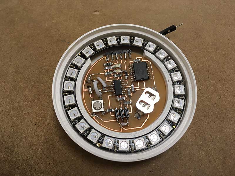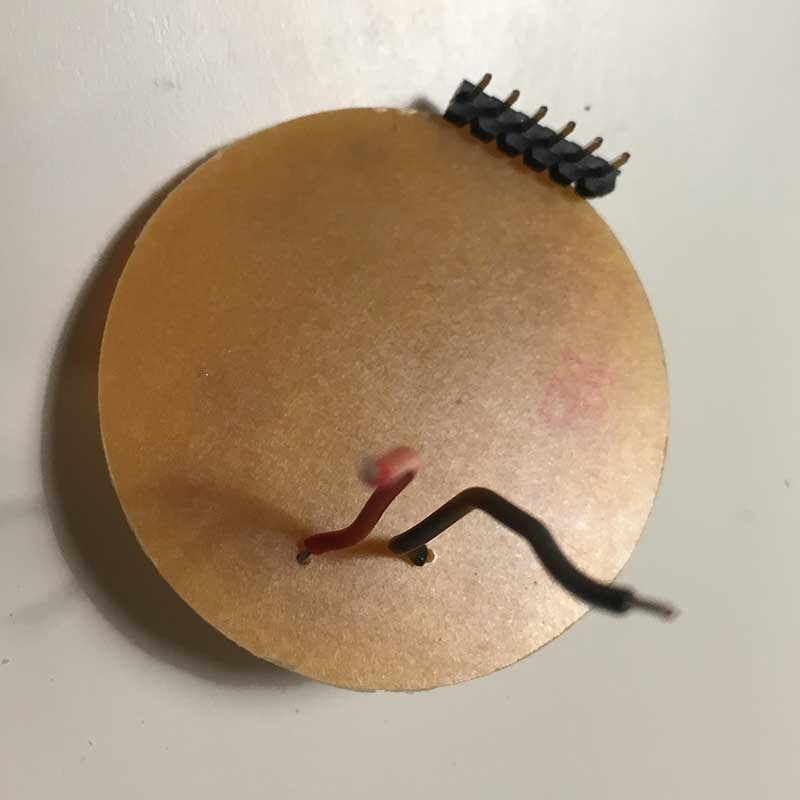 The main component for my Final Project has been the circuit design. Throughout the Fab Academy, I have tested out different ideas. I first adapted the initial Hello Board from the Week 9 Embedded Programming assignment to be able to output to Neopixels. I followed this by making the circuit circular to fit in the middle of the Neopixel ring. I also played with different ways of getting the wiring to the back of the circuit where everything will be connected. This usually required me to drill holes in the board and passing flexible wire between the back of the board and the pins.