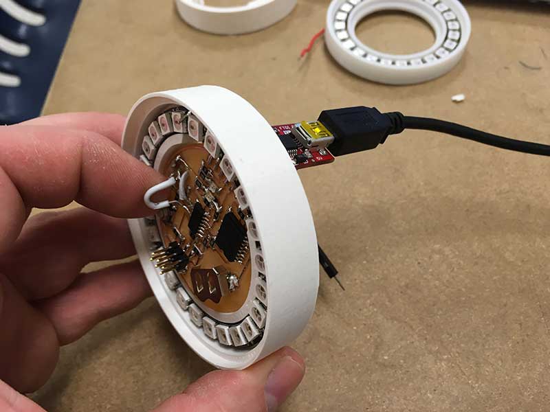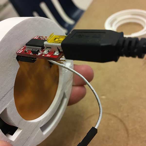 At this stage in the design process, I also started testing the fit with earlier versions of the 3d printed core. I added a flattened edge to the round circuit to better fit the bent FTDI connectors and made the necessary gap in the holder to fit these pins through.