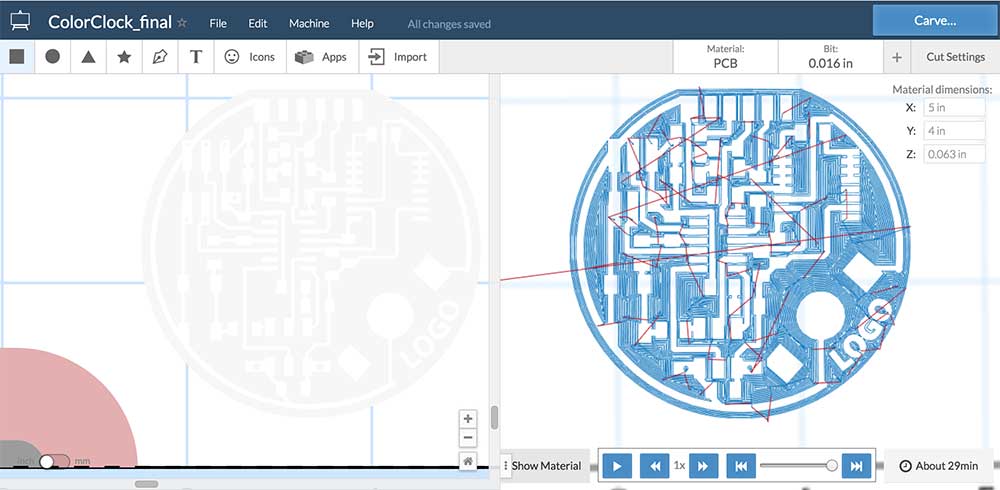 The final version of the Color Clock circuit inlcuded pins connected to the output of a Real Time Clock (RTC) as well as adding traces for the Neopixels and the button. Lastly, adding two wires so that VCC and GND could be passed to the back in the event the clock were to run off of a 5v supply. Milling the circuit is the exact same process that has been done in previous assignments using the Carvey Machine. For more info on this, visit assigments on Week 5 or Week 7.