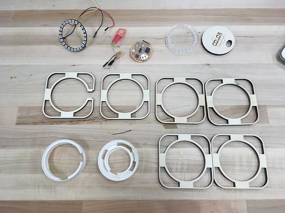 The entire Color Clock can be assembled with 13 pieces. The only pieces that were not made in the Fab Lab include the Neopixel ring and the electronic components.