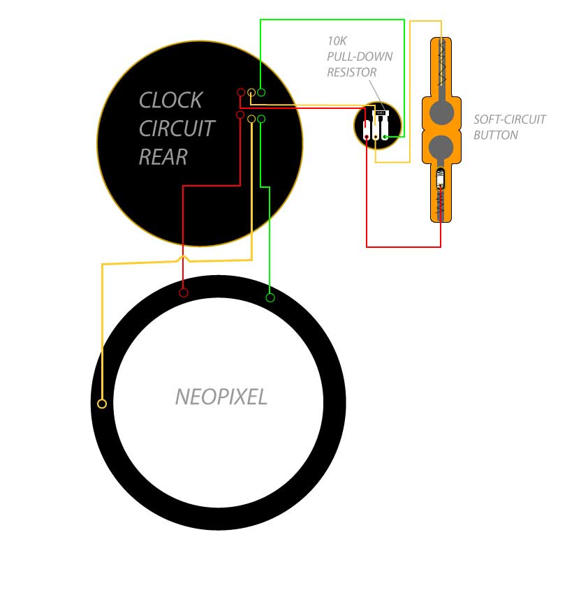 STEP 4: Flip the clock to expose the back side. Take the Neopixel wires and connect them as shown in the diagram above.