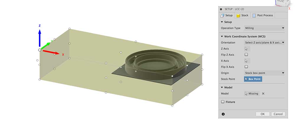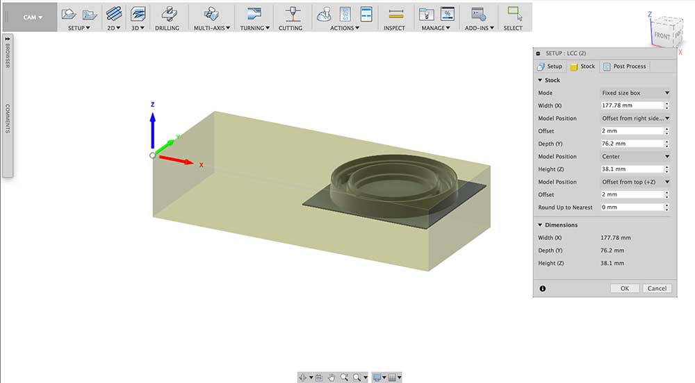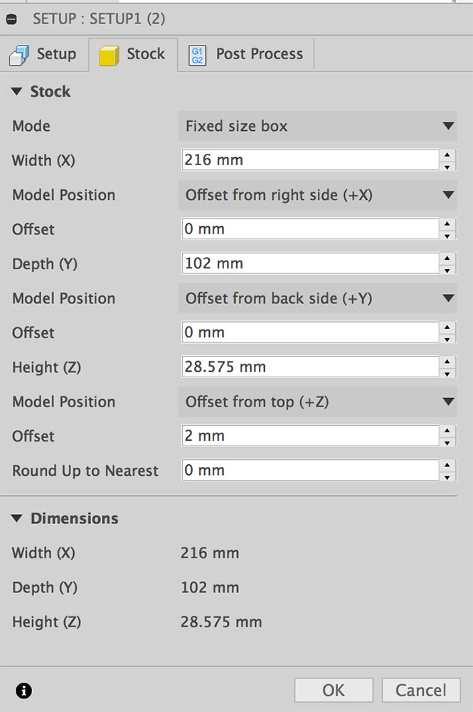 After the quick test, I started prepping for the milling of my model. First I set the dimensions of the stock I was going to use and the position of the model within that stock. I had a piece of milling wax that was 7" (177.78mm) wide, 3" (76.2mm) deep, 1.5" high. I left a 2 mm offset from the top of the stock as well as a 2 mm offset from the right side of the stock and I positioned the model in the center of y. I have very little room on the y axis so centering just ensured that the piece fit within the stock.