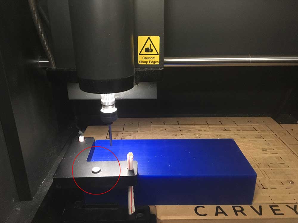 Note:If you are looking at this picture and wondering why I had the straws in there, it is because the Carvey does not come with bolts for stock thicker than 1". The material is secured using double-sided tape so I only needed the clamp for homing purposes. I had to use dowel, straw, and more double sided tape to secure it in place. I later received a gift from my Fab Academy colleague Mark which was the right sized M5 1.5" bolt. This "jerry-rigged" setup worked but I don't recommend it. Inventables sells larger bolts or pick up your own M5 bolts at the hardware store. They are not as common in generic hardware stores in Canada and I was unable to get one the day I worked on this assignment.