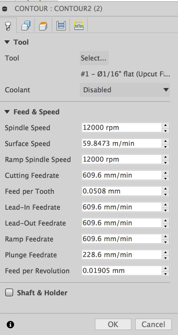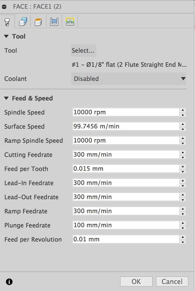 After the stock setup, I selected the feed and speed settings. Generally speaking, keeping the spindle at 10000 rpm for finishing or facing was fine.