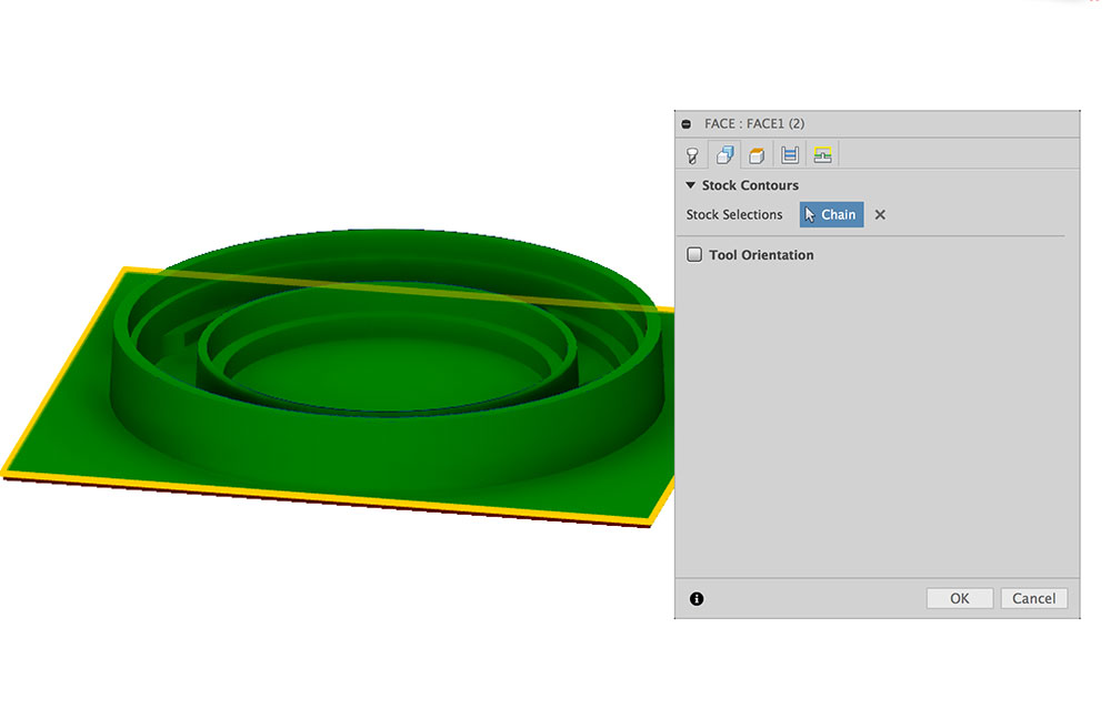 Once the stock settings were set, I needed to program the first tool path which was to re-face the surface of the wax. Although I was using a new piece of milling wax with a smooth surface, this step ensures that the surface of the stock is precisely located where the gcode expects it to be. It will help reduce any discrepencies. The fact that my clamping mechanism was not as precise as it would be with the right bolts, this step was even more relevant. It meant I could mill the wax to the right depth before starting to cut the geometries of my model.
