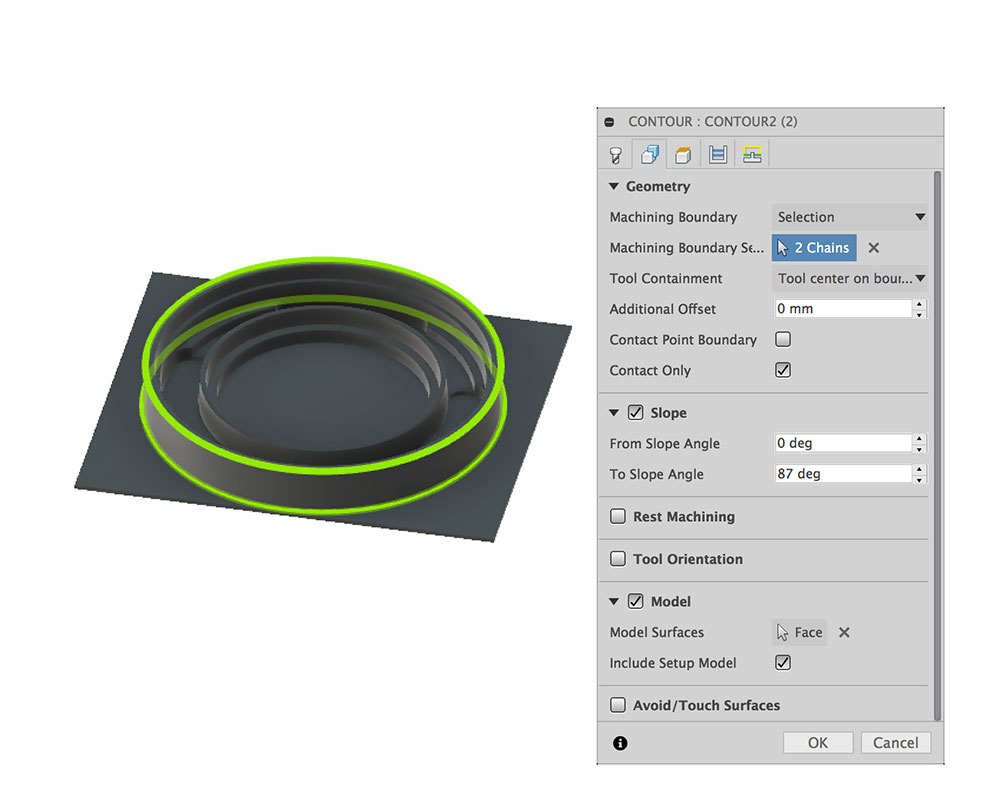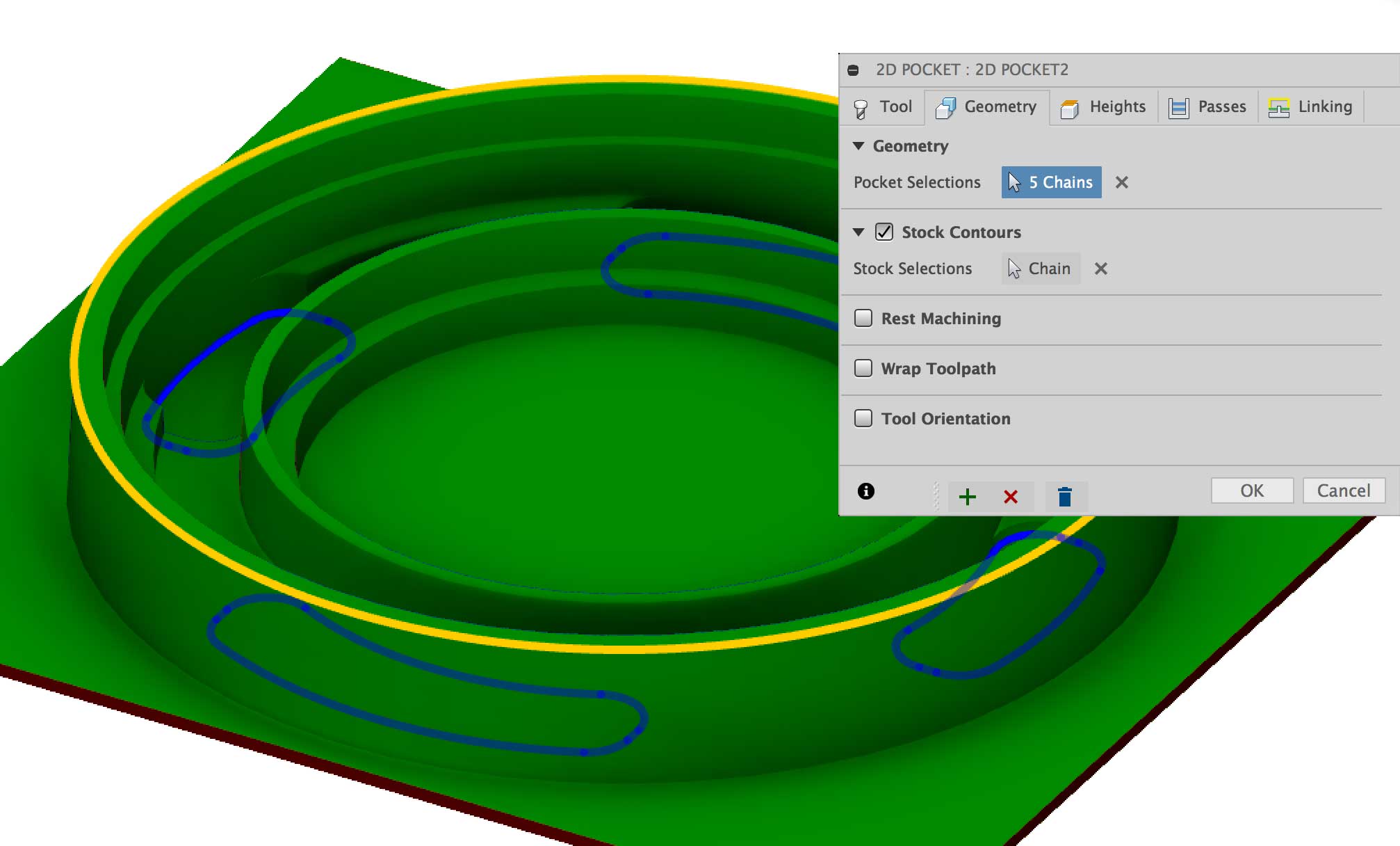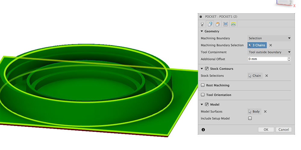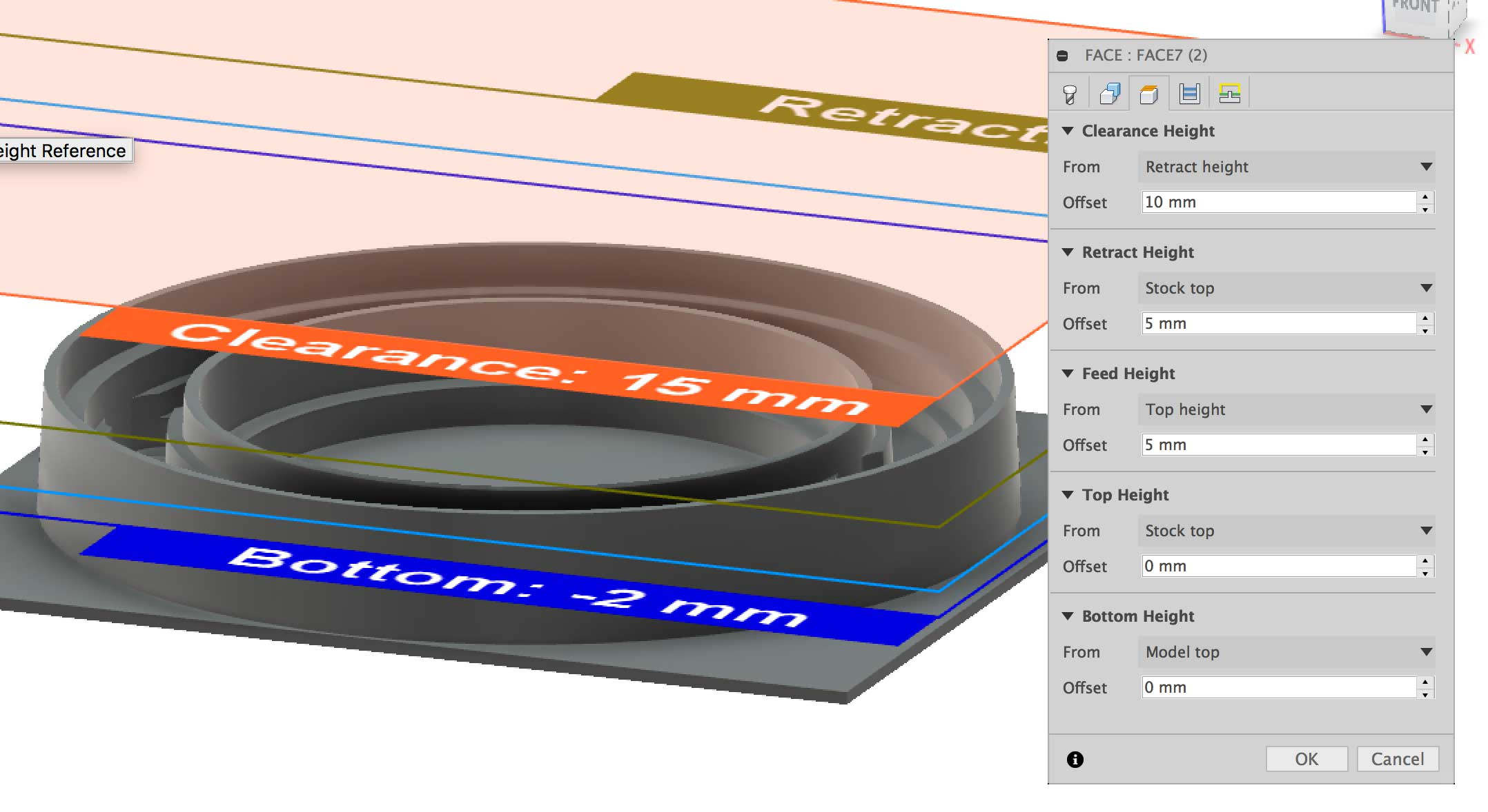 Lastly, I selected the Bottom Height to equal "Model top" and the Top Height to be "Stock top". You will notice Bottom:-2 mm which is the model offset that I had entered in the initial stock setup.