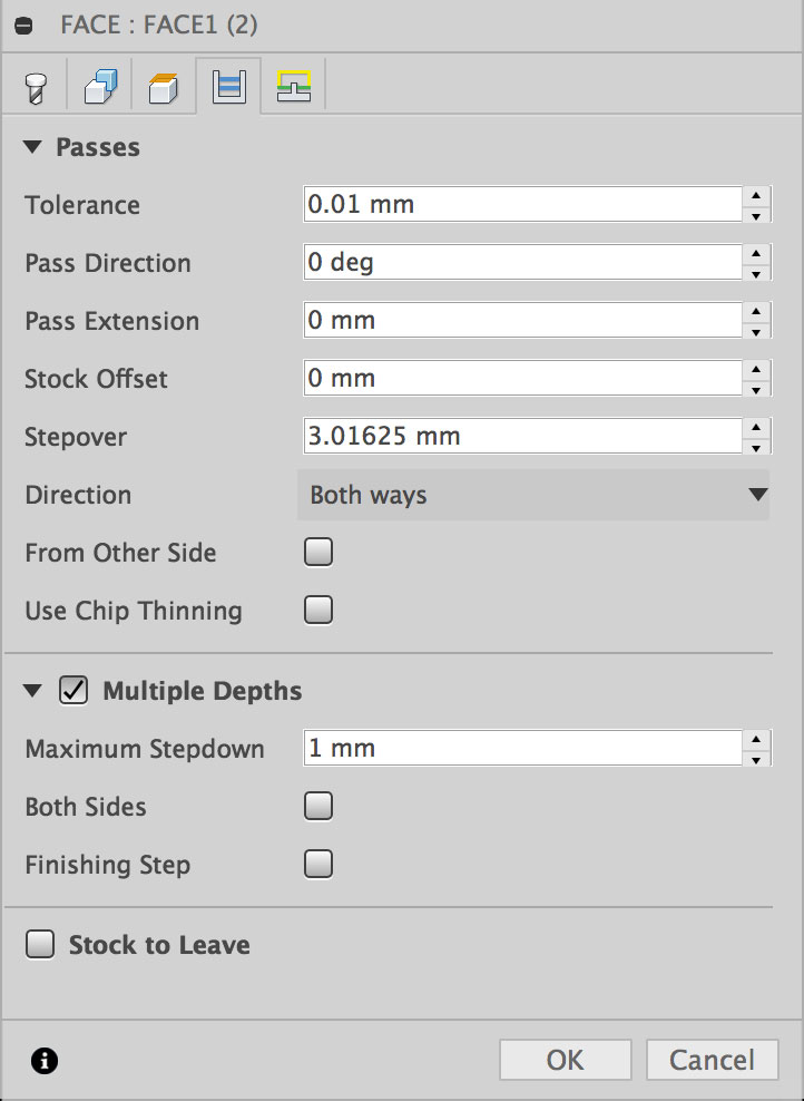 Next I selected the depth per pass by enabling Multiple Depths and selecting it to mill in increments of 1 mm.