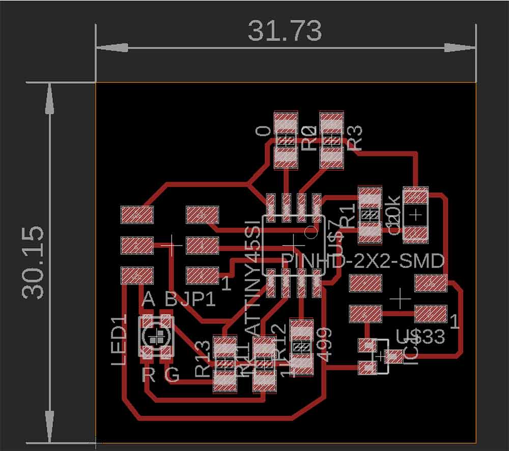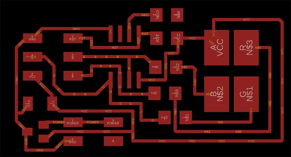 My first attempt was to start re-drawing Neil's example but adding extra pads for future use with NeoPixels. I wanted to understand the relationship between the components by re-drawing it in Eagle before designing a custom board.