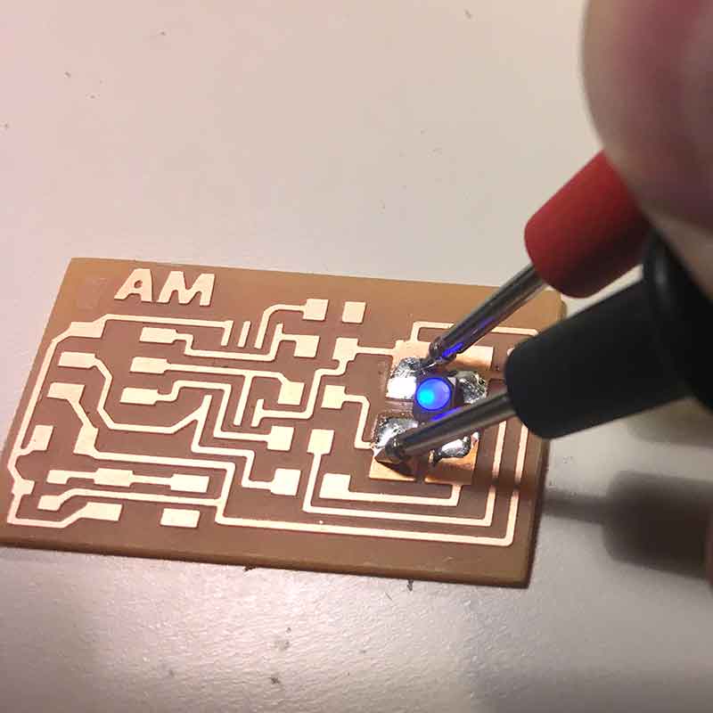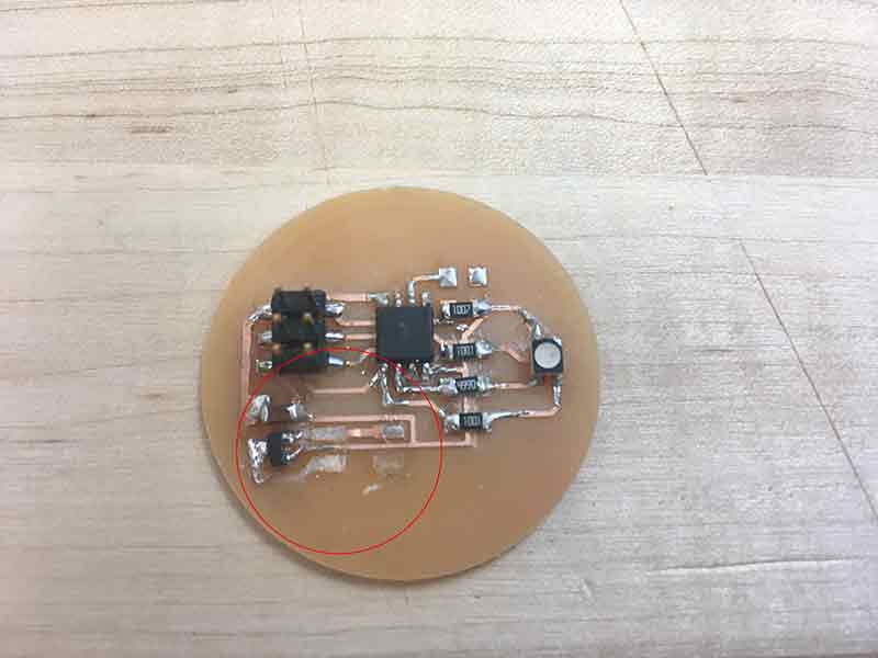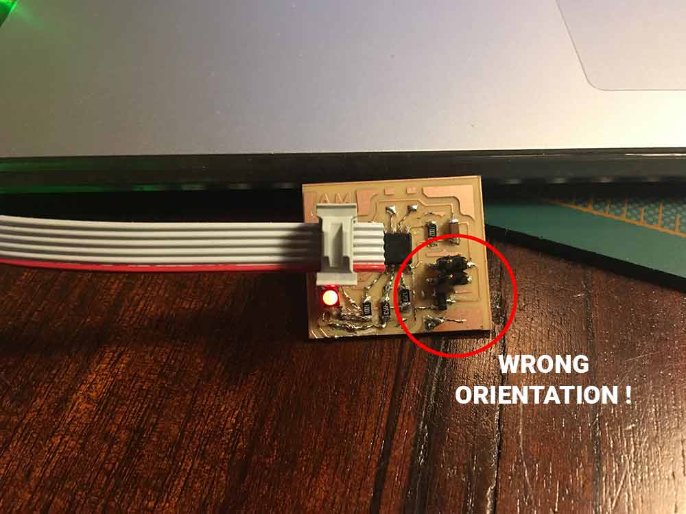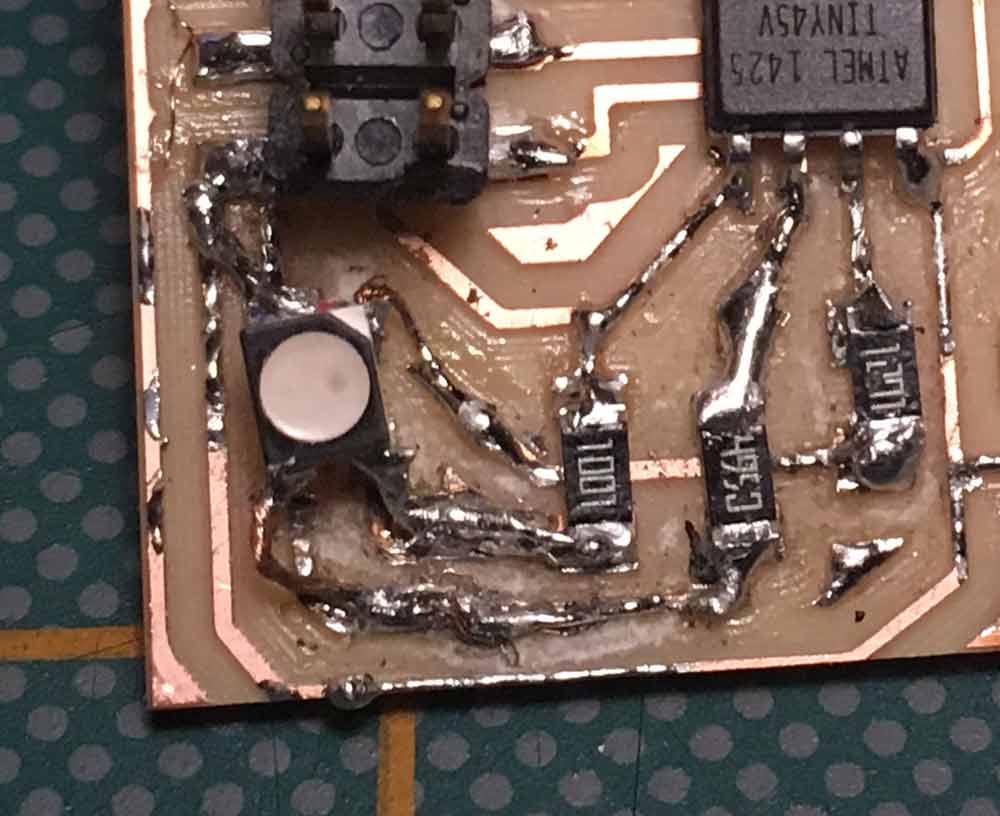 After all this work, when I plugged the board in with an external source there was smoke. Upon review, my voltage regulator was designed on the wrong side of the power input. This means unregulated power was going through the board. I have been pretty lucky in Fab Academy with my boards but today was not my day.