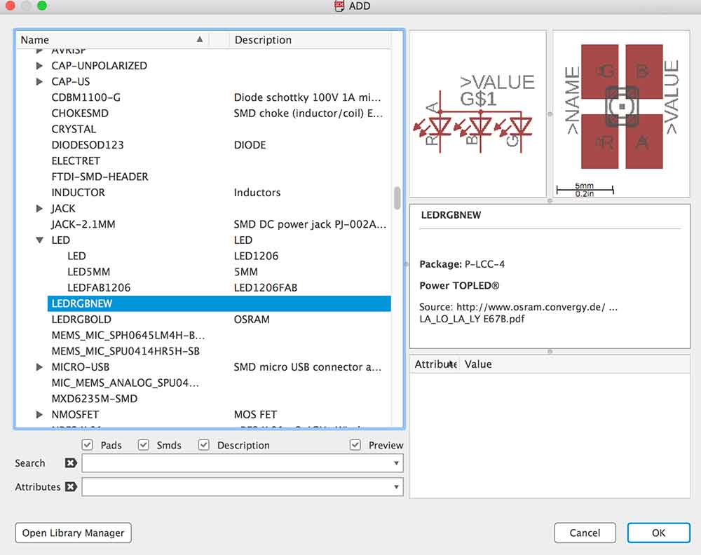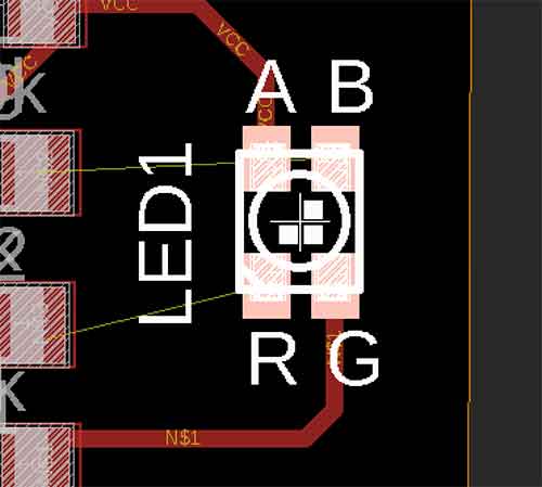 It is important to note that I was following the schematic and the layout of the part. If you look at the Eagle board above you will see that I matched the labeling. However, this LED is not the same. R is in where B is supposed to be.