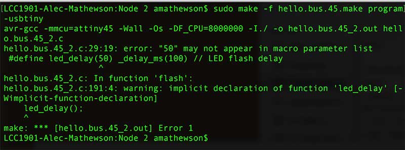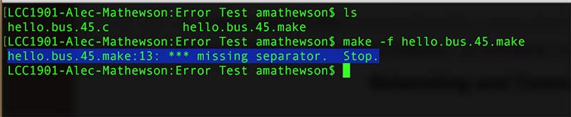 I decided to grab a makefile from a previous download where I was confident I did not have any problems. I took a look at the makefile from the Input week. Unlike the hello.bus.45.make file from this weeks assigmnet there were no extra spaces after the tabs. I find it hard to beleive that this is the issue. I copied over the makefile from input week and changed it from hello.light.45.make to hellos.bus.45.make. I also changed the project file name in the makefile to match.