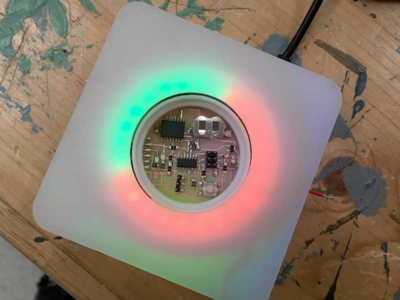 A final version of the circuit holder has been designed and made. It holds the clock circuit and NeoPixel ring. Adjustments have been made to allow for rear access to the FTDI.