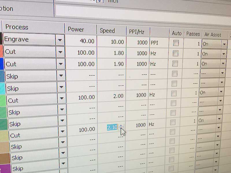 I started with testing the cutting of canvas. I lowered the power and the PPI significantly and used the initial settings for paper which were included in the Job Control software. Even though you can get good cuts at higher power settings I prefer to find the lowest power settings needed. As the Co2 laser ages, you can make small adjustments to compensate. If you are not careful, novice users of the machine, like many k-12 students, will be putting a lot more power into jobs than necessary.