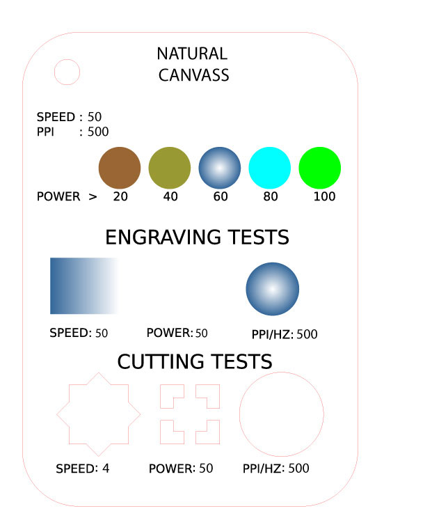 I decided to do some tests with natural canvas and Trotec Plywood which are two materials that I had on hand that differ from the materials being tested by others in my group. An interesting future test would be to determine the difference in settings between machines of different age. Different labs will have different results with the same parameters.