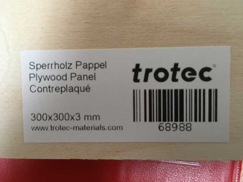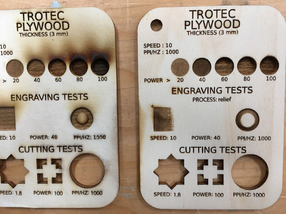 Trotec sells an engineered plywood that is ideal for laser engraving. It is more expenive but is very flat and apparently contains less of the nasty stuff you might find in generic plywood. The wood is much lighter than generic plywood and does not require the same settings. One of the things I dislike is seeing laser cut plywood with lots of burn marks. This is hard to control sometimes when you jump into a cue on an unfamiliar machine in a lab and I won't toss a good cut just for the look of it unless it is specifically necessary. The goal in this test is to find the minimum cut settings required to cut Trotec plywood with no burn marks.