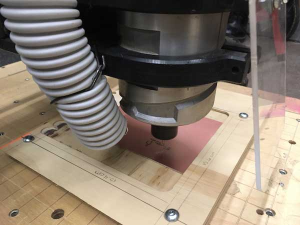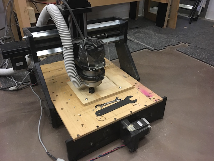 Before milling, we need to set up the machine. It might look funny to see it on the floor but the results were better this way. Less vibration. First we need to add the 1/64" bit to the router. We do this with the machine "off"