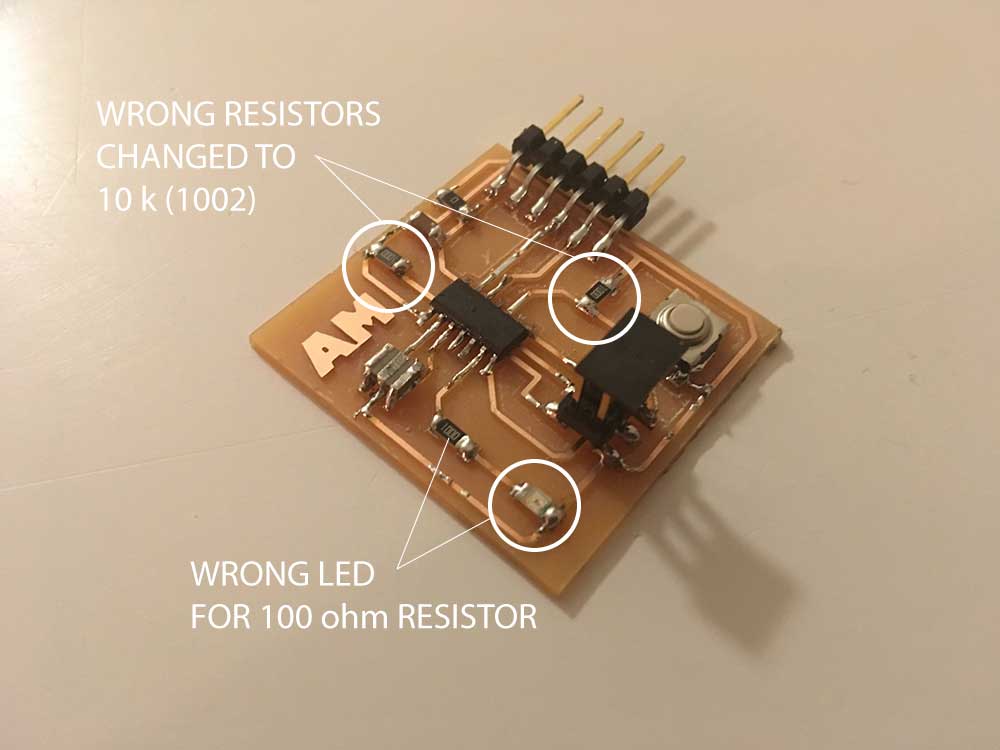 Not only did I accidentally put the wrong resistors on, I put a 100 ohm resistor for the LED, thinking it was a blue LED. The LED is an orange one and actually requires 150 ohm or higher resistor.