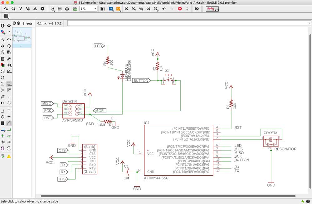 ---> Adding components - use this to add the elements that you need from the Fab Lab Eagle Library. I learned how to do that by following the Fab Academy tutorialHERE.