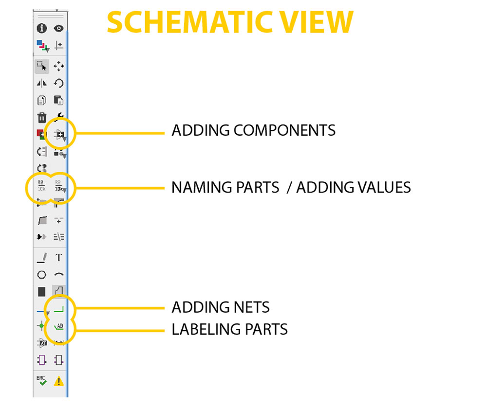 ---> Adding nets - the net tool is bsically how you wire your board. You add nets between the components or between the component and your label. This is how you know how to connect everything once you get to the board view---> Labeling parts - the label tool is one of the most important. You can identify what the different pins are and where you nets are connected to. You need to name your labels once they are done.