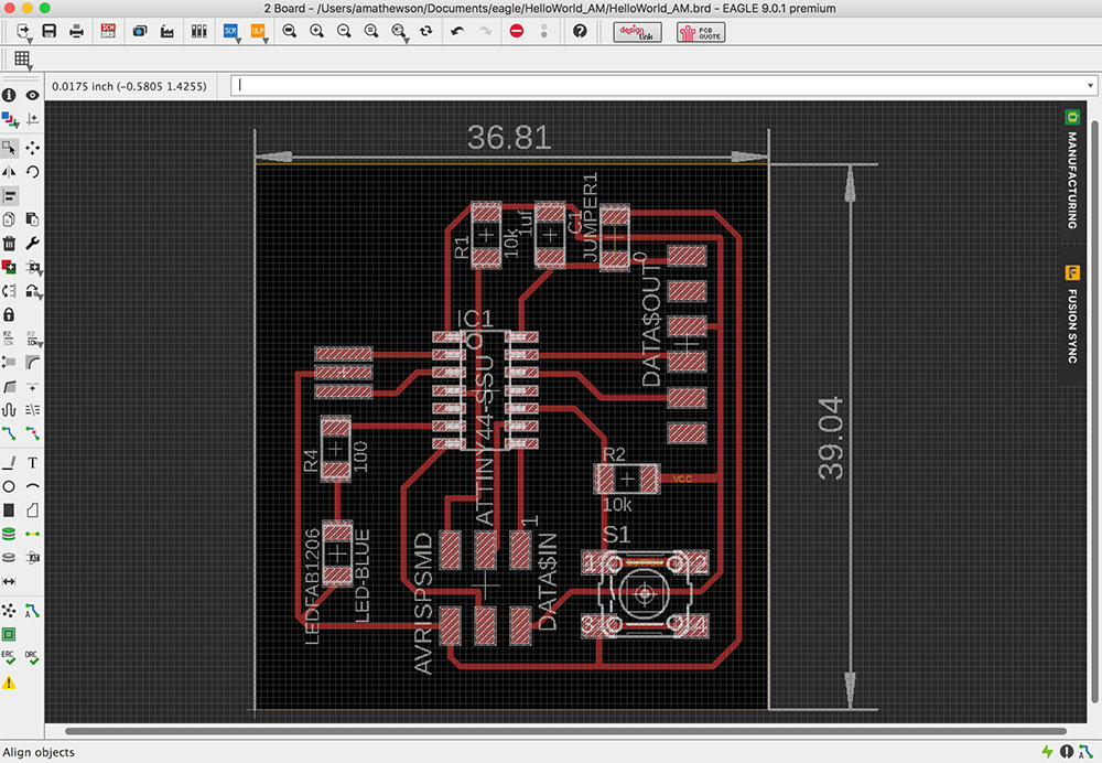 Designing a board in Eagle is kind of like working on a puzzle. There are limitations to what you can do and you have to work around them. Like in the schematic view, there were only a handful of tools I actually used for this project.