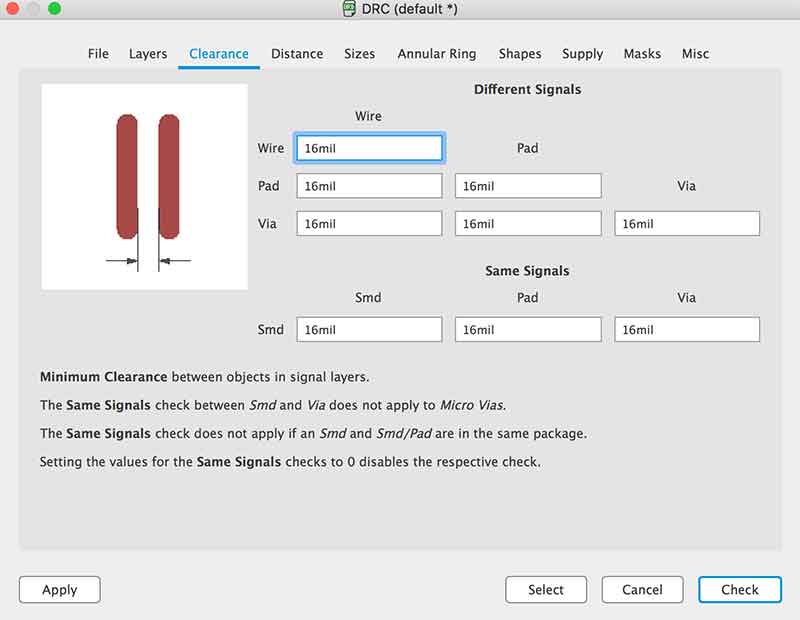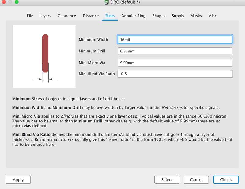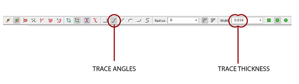 When using the traces tool you have options to help control how it behaves. I would often change the way the traces behaves by adjust the angle that it prefers. By far, the most important element here is to set your trace width. I found 0.016" to be the best. It matches size of the milling bits I use. When setting the other design rules by selecting the DRC tool in the Tools menu, I set anything that has to do with basic spacing of the traces to 16 mil. This seemed to work out nicely.