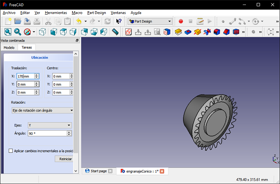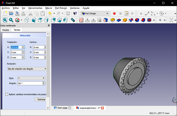 In the same way I created another gear, with a module at 3.2 mm, then I changed the X coordinate to 104 mm in location and the Y axis rotation to 90°.