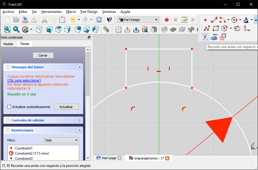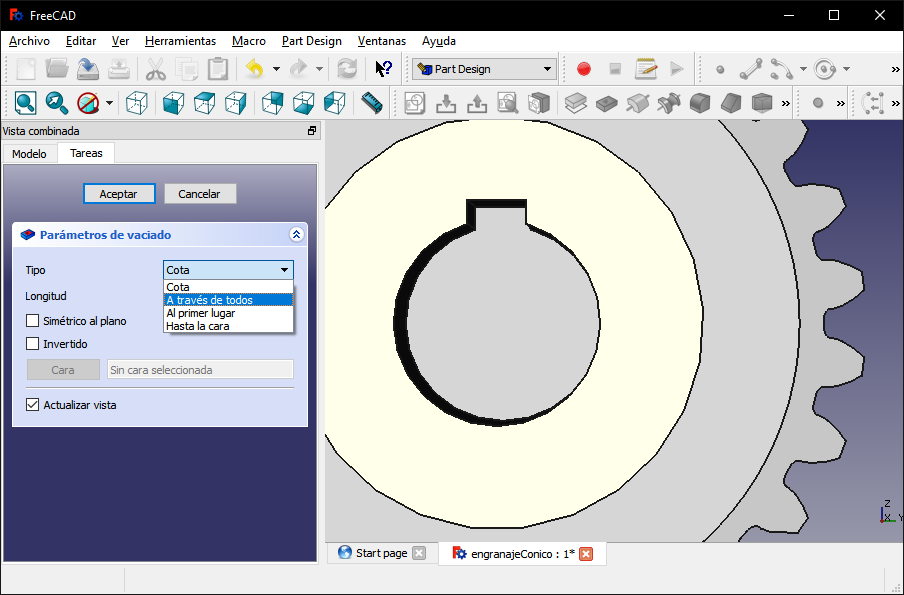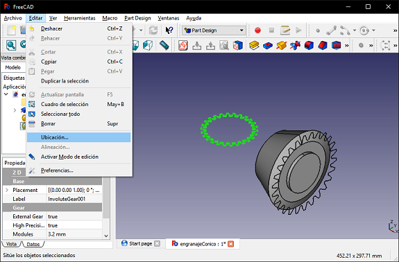 I hid the initial sketches and selected the "Part Design" work scenario, then I selected the lower face of the gear and selected the