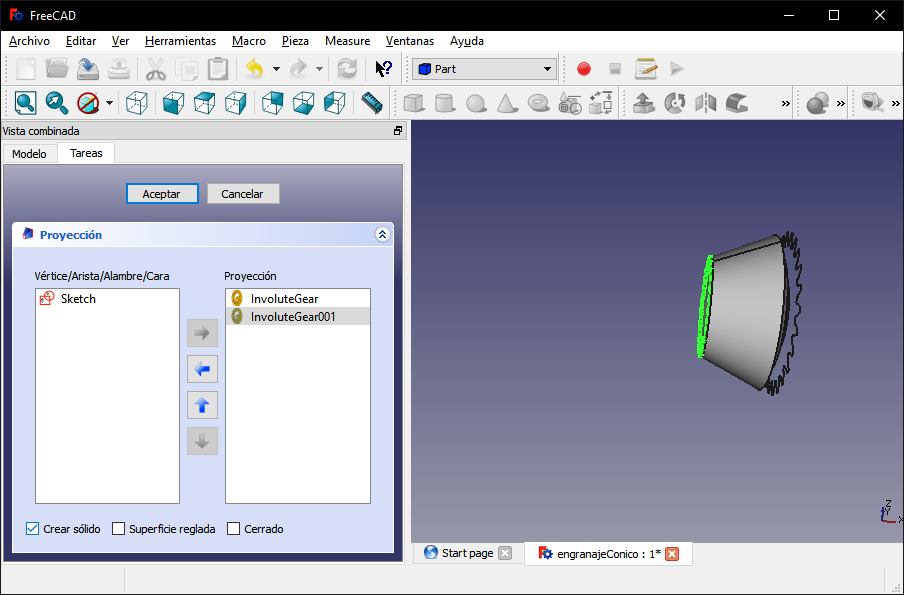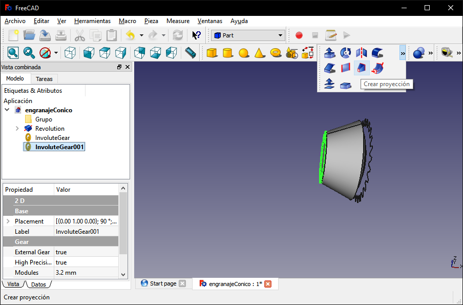 I selected the "Part" work scenario and with the projection creation tool I selected the last two created objects and checked the check to create a projection.