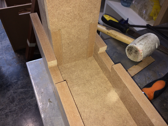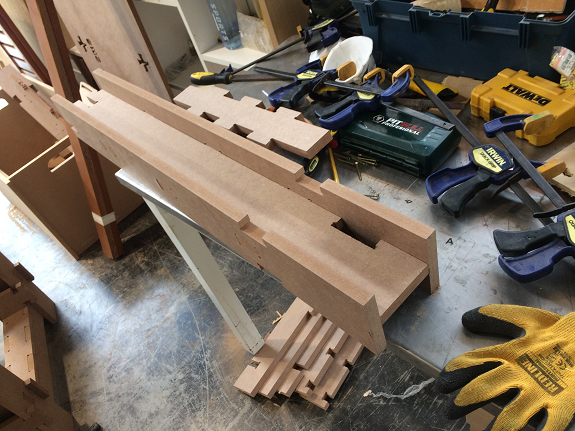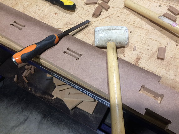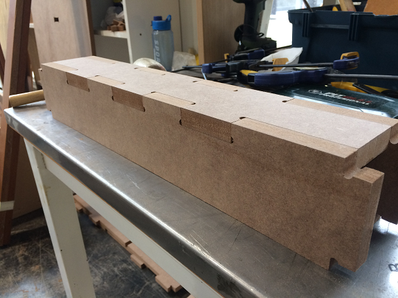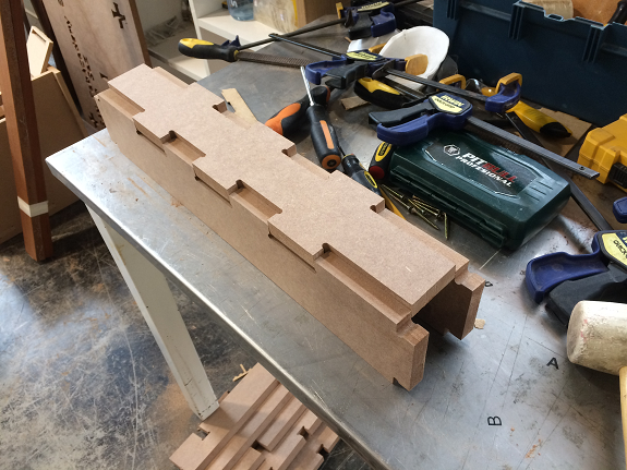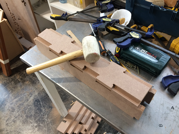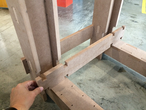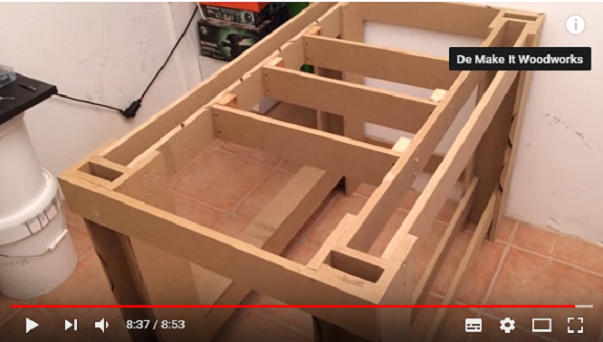 Finally I found a construction video of a workbench with MDF in "Make it Woodworks", but in the video they did not use press-fit but screws and glue. The interesting thing was the way he made the legs of the workbench, he did not join several plates, he used only three to form an "H" profile.