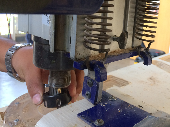 With the Shopbot turned off we can move the milling carriage forward to make it easier to remove the milling mandrel.