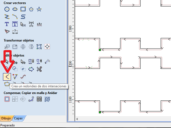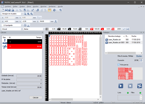 After having all the pieces located in the same plane, it is selected and exported as a DXF file, to be opened in the computer that is connected to the Trorec. The DXF file is read from Coreldraw, there it is given the "last adjustment", all the lines must be with the attribute of "fine line", the lines that are for cutting in red color and the lines for engraving in black color.