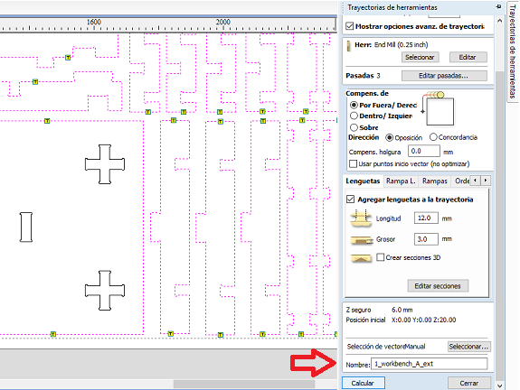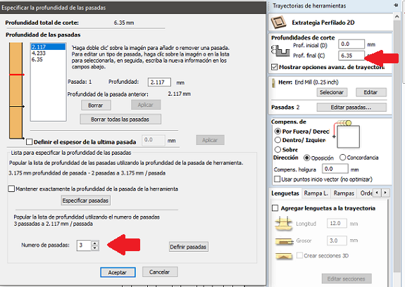 The milling bit I used was 1/4 ", I made sure that this measure was selected.The depth of each pass of the milling bit should not be greater than its width, otherwise, the risk of breakage increases. For that reason and for that thickness of material I assigned 3 passes.