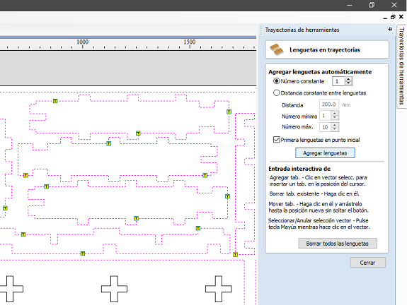 To ensure that no part already cut is moved and causes a bad cut or break of the milling drill or any other accident, you must define fastening points, these can be added automatically or manually. I added them manually, only two per piece and in the same places, so removing them with a rasp is faster.