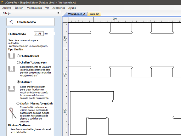 If I had maintained the definition up to this point, the milling bit would have made all the round inner corners and then could not fit any part, to avoid this VCarve has a tool that adds "T-Bone" or "Dog-Bone" to the corners. The arrow points to the access icon.