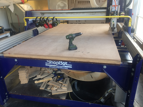 The software of the Shopbot has a functionality that allows to calibrate the exact position of the milling bit. When activated, the milling carriage moves to the position x = 0, y = 0, ie to the left front corner.