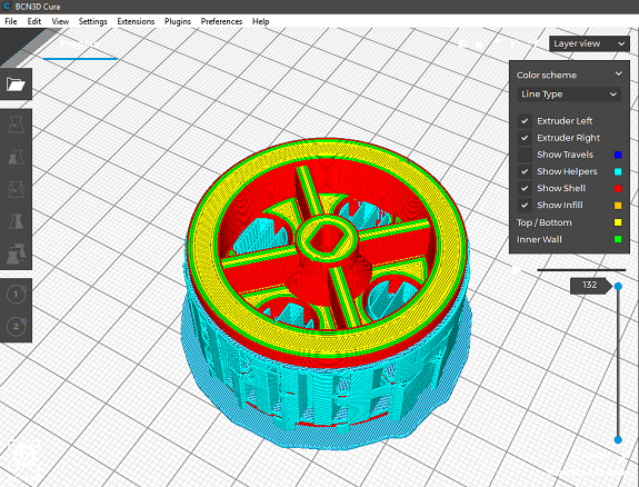 I exported the Rim as an STL file and I opened it with the BCN3D Cura software, in this picture you can see how it will make the filament layers.