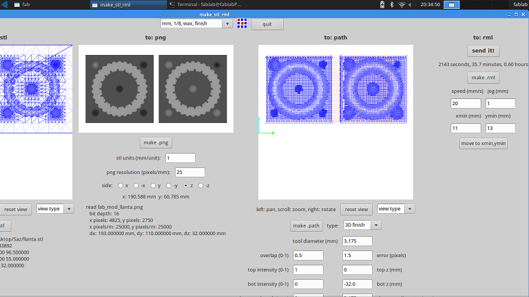 The next step was to create the path, by clicking on the "make .path" button, after a few minutes of processing the paths that the milling bit will follow will be drawn on the right side of the screen.