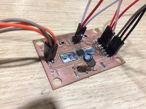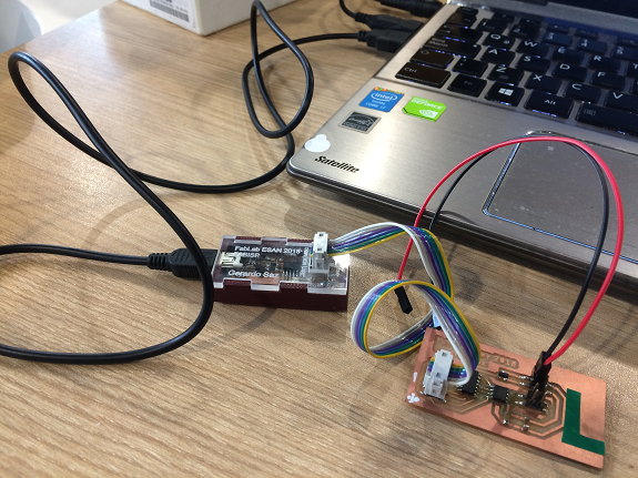 I connected one of the PCBs to my FabISP programmer and this in turn to my laptop to load the program.