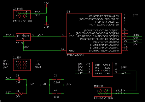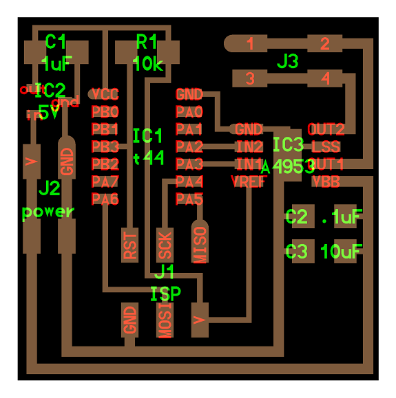 This board carries the controllers ATtiny44 and A4953 which is responsible for the H-Bridge.