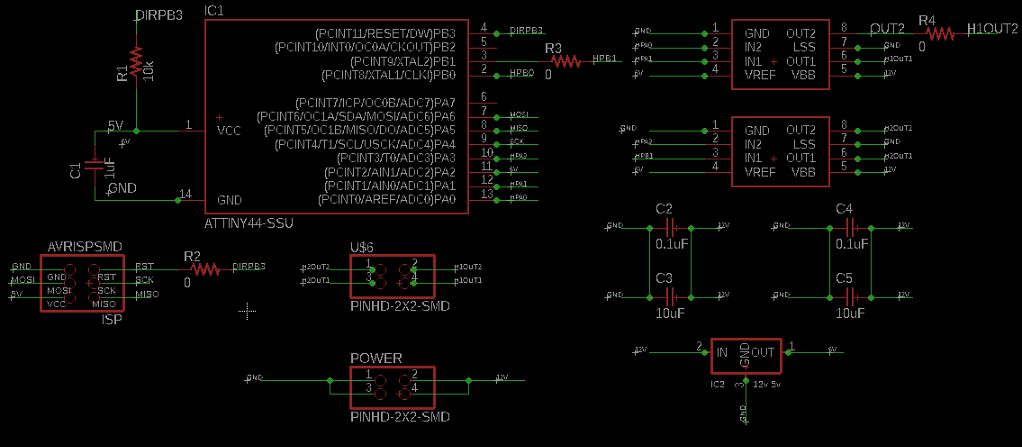 According to my schematic diagram, the right motor microcontroller is connected to pins # 13 and # 14 of the ATtiny44. While in the case of the left motor microcontroller are pins # 10 and # 3.